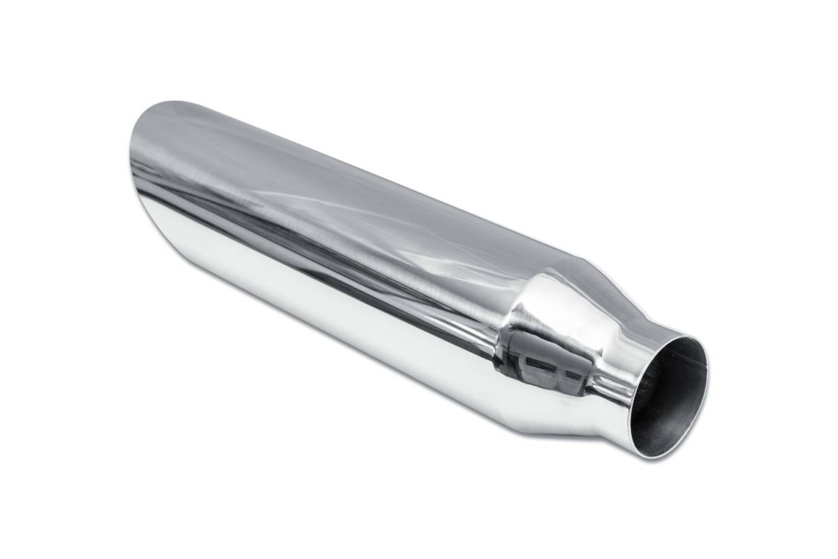 This single wall exhaust tip features a 3.5" angle cut outlet connected via a 2.5” inlet, which is able to be clamped-on or welded-on to the vehicle.